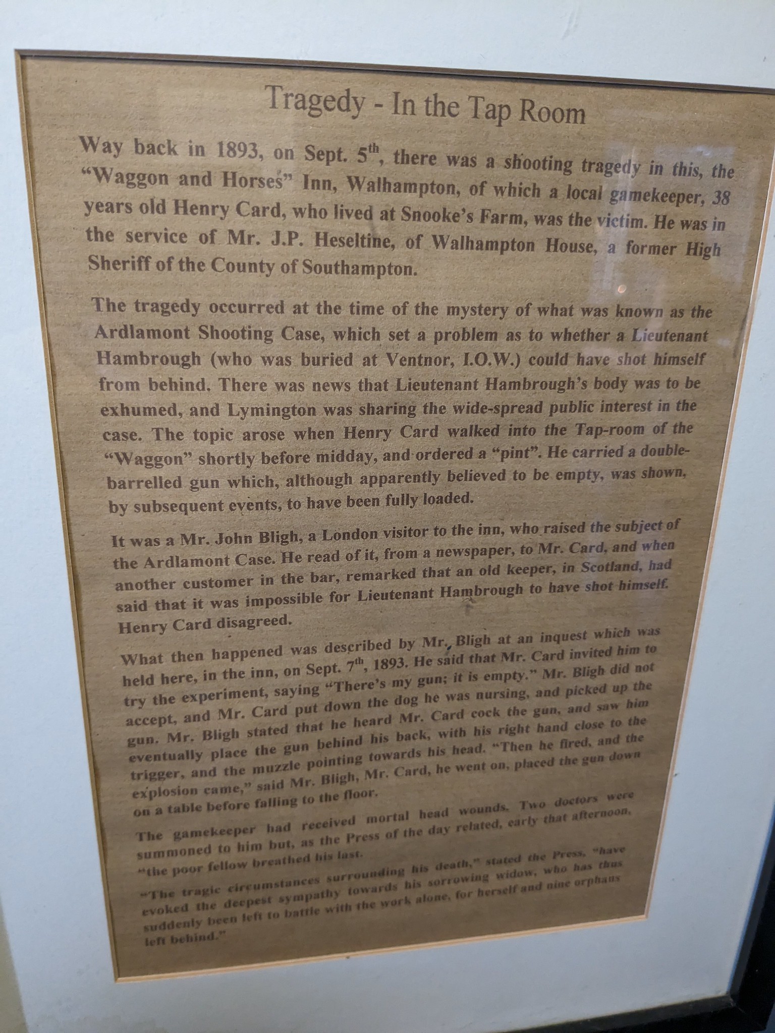 John Bligh, of London, staying at the Waggon and Horses, was told at about half past eleven that Mr. Card was in the house and he wanted a pint of beer, with which he supplied him; another customer had a pint of beer, and after drawing that and a pint for himself he went into the tap-room and asked Mr. Card to drink. He said to deceased “I see they have had rather a scene across in the Island, or at Ventnor.” He said “Is that that gentleman that was shot in Scotland?” Witness fetched the paper, and read the article to him, some gentleman sitting in the room said that the old keeper in Scotland said it was impossible for Lieut. Hambrough to have shot himself as he was shot, Card replied