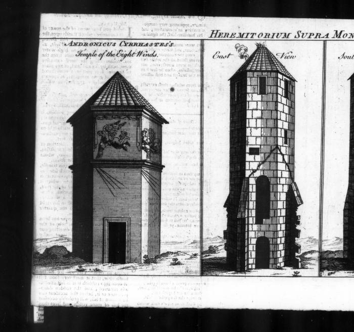 I have added a view of this temple, which was of marble; on each side was carved, in bass relief, a representation of the wind of that quarter which it fronted; and on the point of the roof, which was a pyramid of marble, a brazen Triton was placed, as a weathercock, holding a small rod in his right hand, which pointed to the quarter from which the wind blew.